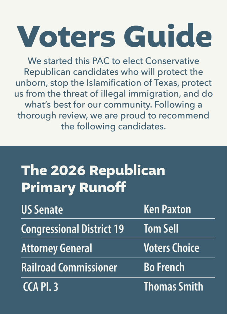 Panhandle Conservatives are dedicated to upholding the foundational principles of limited government, fiscal responsibility, individual liberty, and traditional family values. As a Conservative political action committee, we support candidates who prioritize the interests of Panhandle residents, ensuring that our community remains a bastion of prosperity and moral integrity. Candidates we support align with the Republican Party of Texas Platform and Principles.